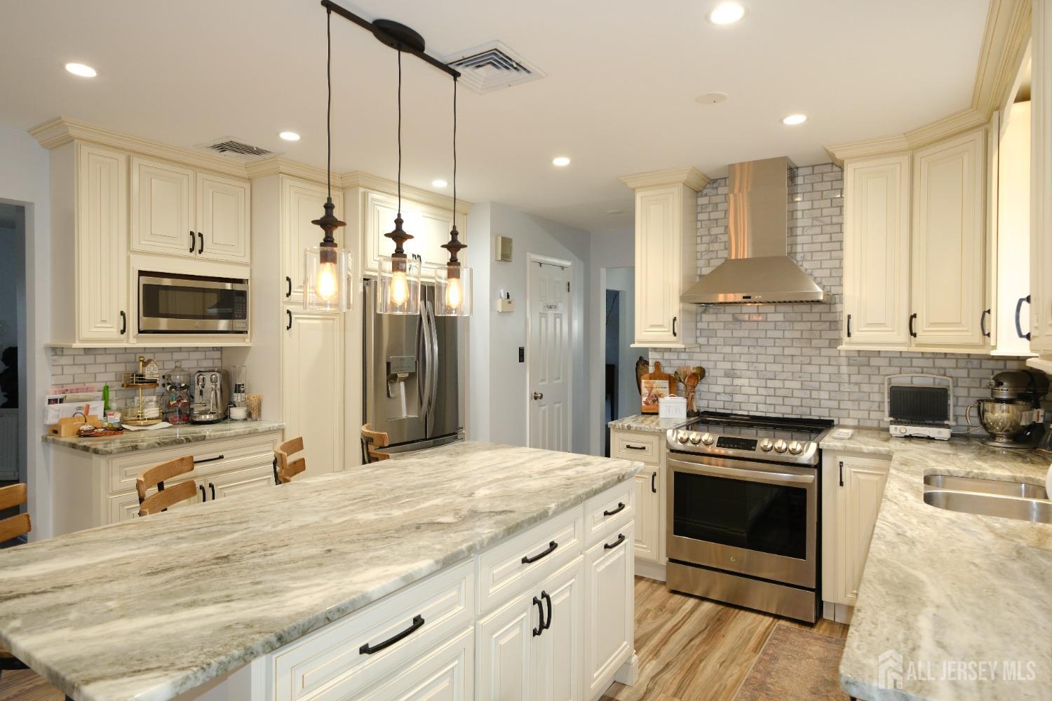 Exceptional 4 bedroom 3 & 1/2 bath home ! This custom home boasts exquisite detail, fine finishes & STYLE. Beautiful entrance with foyer, hardwood floors throughout, & modern lighting. First floor features luxury eat in kitchen with kitchen island, stainless steel appliances & pantry. Expansive Living room w/ fireplace, formal dining room, half bath. Second floor features large Master bedroom ensuite w/ two closets, and full bathroom. Three bedrooms. Large Main Bathroom. Ground floor with two car garage, separate kitchen, and full bathroom. New high efficiency heat and central A/C. Short distance to schools, NYC transport & major highways. This is a must see !